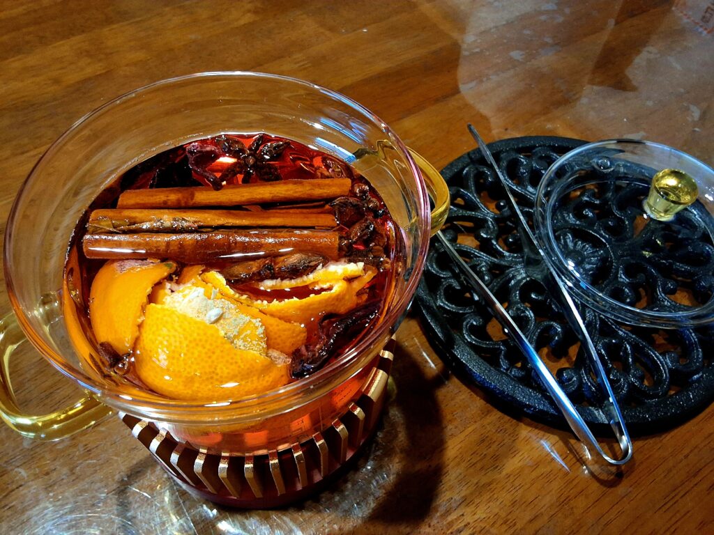 ティーキャンドルで水を張ったガラスの鍋をゆっくり温めると、部屋中にシナモン、スターアニス、クローブ、ローゼル、オレンジ🍊の優しい香りが立ち込めて、