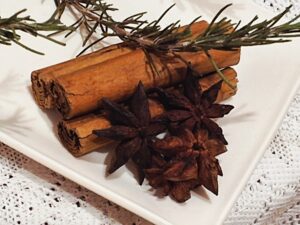 クリスマスの香りも大好きなので、シナモンスティックとスターアニスに、スウィートオレンジとペパーミントの精油を垂らしてみました。